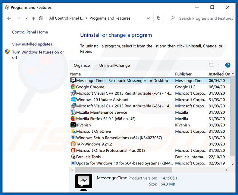 Dans la fenêtre de désinstallation des programmes, recherchez "MessengerTime - Facebook Messenger", sélectionnez ces entrées et cliquez sur "Désinstaller" ou "Supprimer".