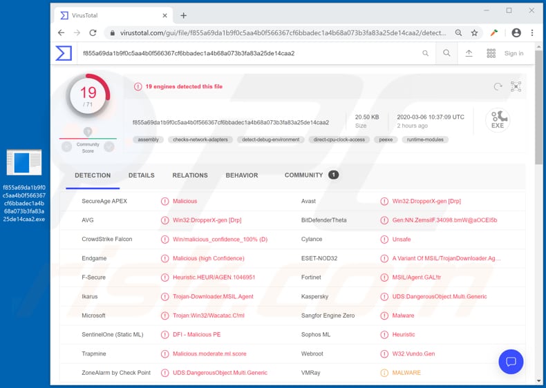 | Noms de Détection | Avast (Win32:DropperX-gen [Drp]), BitDefender (Trojan.GenericKD.33518015), ESET-NOD32 (Une variante de MSIL/TrojanDownloader.Agent.GAO), Kaspersky (HEUR:Trojan-Downloader.MSIL.Seraph.gen), Liste complète (VirusTotal) |