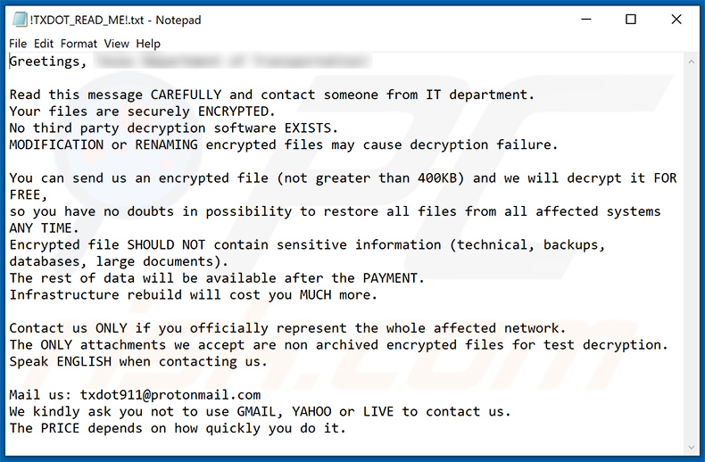 Texte présenté dans le fichier texte du rançongiciel Txdot ("!TXDOT_README_ME !.txt") :