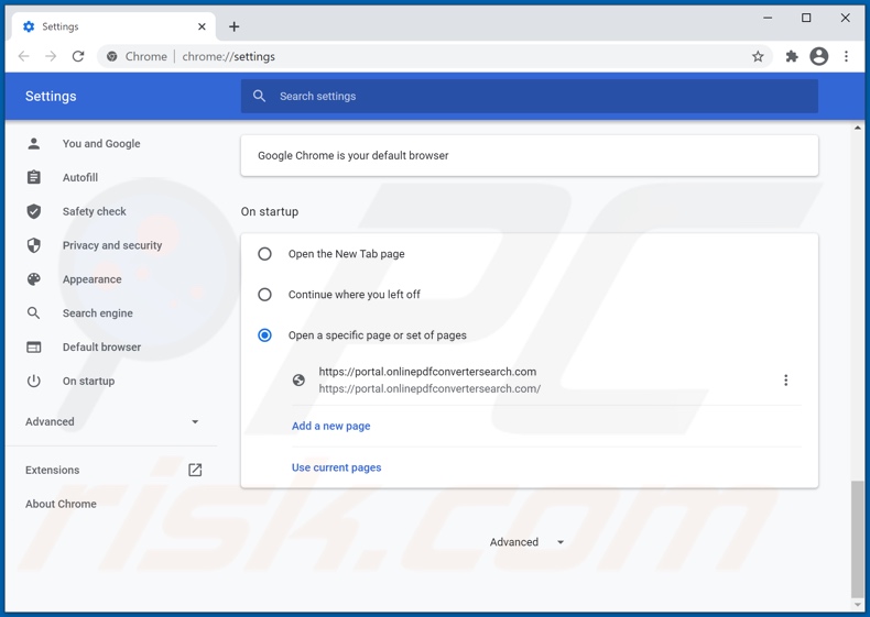 (dans le coin supérieur droit de Google Chrome), sélectionnez "Paramètres". Dans la section «Au démarrage», désactivez "OnlinePDFConverterSearch", recherchez une URL de pirate de navigateur (hxxp://www.onlinepdfconvertersearch.com) sous l'option "Ouvrir une ou un ensemble de pages". Le cas échéant, cliquez sur l'icône des trois points verticaux et sélectionnez "Supprimer".