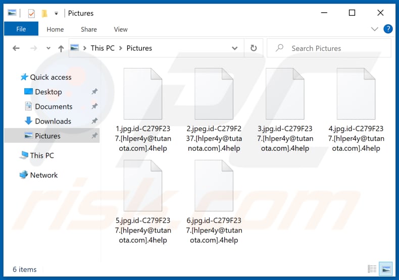 4help a été découvert par Jakub Kroustek, il appartient à la famille des rançongiciels appelée Dharma. Il crypte et renomme les fichiers et génère deux notes de rançon. 4help renomme les fichiers en ajoutant l'ID de la victime, l'adresse courriel hlper4y@tutanota.com et en ajoutant ".4help" comme extension de fichier. Par exemple, il renomme un fichier nommé "1.jpg" en "1.jpg.id-C279F237.[hlper4y@tutanota.com].4help", "2.jpg" en "2.jpg.id-C279F237.[hlper4y@tutanota.com].4help", et ainsi de suite. 4help affiche une fenêtre pop-up et crée le fichier texte "FILES ENCRYPTED.txt", tous deux contenant des instructions sur la manière de contacter ses développeurs.