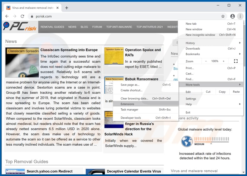 dans le coin supérieur droit de Google Chrome), sélectionnez "Plus d'outils" et cliquez sur "Extensions". Localisez tous les modules complémentaires de navigateur suspects récemment installés (comme "d8yI+Hf7rX") et supprimez-les.