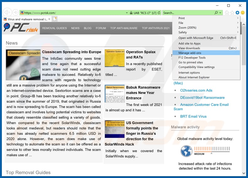 (dans le coin supérieur droit d'Internet Explorer), sélectionnez "Gérer les modules complémentaires". Recherchez les extensions de navigateur suspectes récemment installées, sélectionnez ces entrées et cliquez sur "Supprimer".