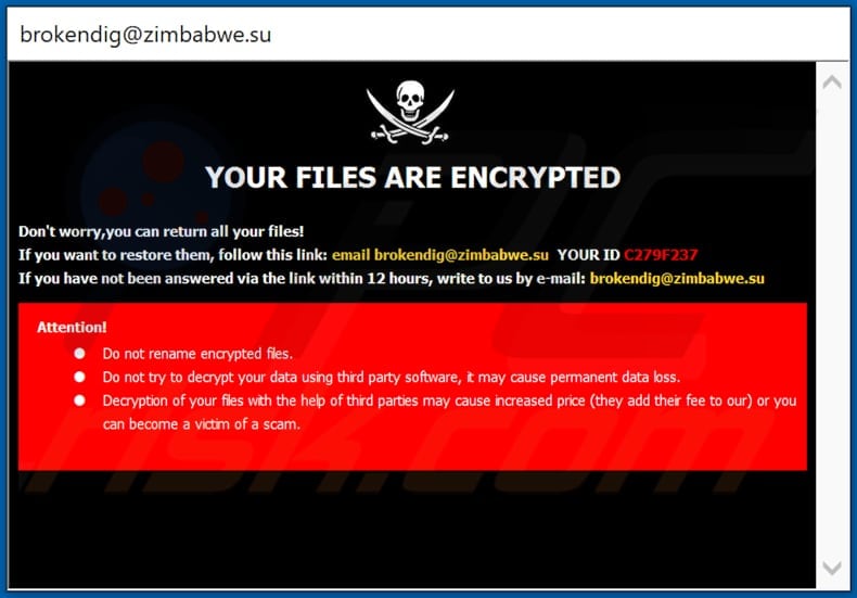 La plupart du temps, des maliciels comme Pirat affichent ou créent (ou les deux) une note de rançon ou plusieurs notes pour fournir des détails tels que l'adresse courriel que les victimes peuvent utiliser pour contacter les attaquants, le prix d'un logiciel ou d'une clé de décryptage, une autre Bitcoin ou une autre adresse de crypto-monnaie et quelques autres informations. Les notes de rançon de Pirat informent les victimes qu'elles peuvent restaurer l'accès à leurs fichiers en suivant les instructions qu'elles recevront après avoir écrit un courriel à brokendig@zimbabwe.su. Il avertit également les victimes de ne pas renommer les fichiers cryptés ou d'essayer de les décrypter à l'aide d'un logiciel tiers, car cela pourrait endommager les fichiers de manière irréversible. En règle générale, après avoir contacté les attaquants, les victimes de rançongiciel reçoivent des détails tels que le prix d'une clé de déchiffrement (ou d'un logiciel) et comment le payer. Le plus gros problème en étant victime d'une attaque de rançongiciel est que les cybercriminels derrière les rançongiciels sont les seuls à pouvoir fournir le bon outil de décryptage. Malheureusement, il n'existe pas d'outils tiers capables de décrypter les fichiers cryptés par le rançongiciel Pirat.