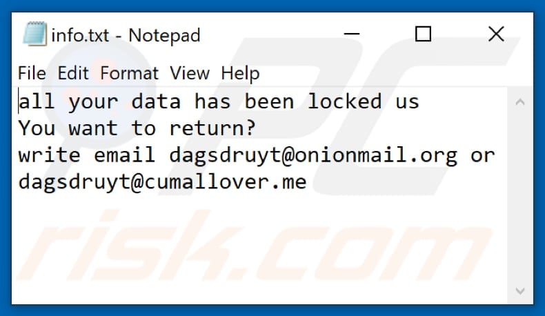 En règle générale, une note de rançon générée par un maliciel de ce type contient une adresse courriel (ou des adresses) pour contacter les attaquants, le prix d'un outil de décryptage (généralement, en Bitcoins ou dans une autre crypto-monnaie), la date limite de paiement et quelques autres détails. Les notes de rançon de Cum fournissent des instructions sur la façon de contacter les attaquants et avertissent les victimes de ne pas renommer les fichiers cryptés ou d'essayer de les déchiffrer à l'aide d'un logiciel tiers, car cela pourrait les endommager définitivement. Les deux notes de rançon demandent aux victimes d'écrire aux attaquants un courriel à dagsdruyt@onionmail.org ou dagsdruyt@cumallover.me, et d'attendre d'autres instructions. En règle générale, après avoir contacté les attaquants, les victimes reçoivent une adresse de portefeuille Bitcoin et le montant en crypto-monnaie à payer pour un outil de décryptage.