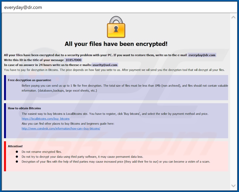 All your files have been encrypted due to a security problem with your PC. If you want to restore them, write us to the e-mail everyday@dr.com