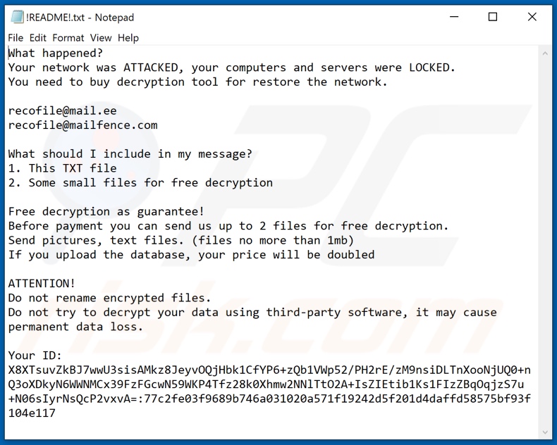 Le message de demande de rançon ("!README!.txt") informe les victimes que leur réseau a été compromis et que les données ont été verrouillées. Pour restaurer les fichiers cryptés, les victimes doivent acheter les outils de décryptage des cybercriminels à l'origine de l'infection. La note demande d'écrire aux adresses courriels fournies. Les lettres des victimes doivent inclure "!README!.txt" et deux fichiers cryptés pour tester le décryptage.