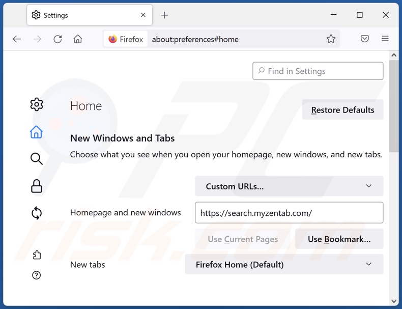 - ÉTAPE 3. Suppression de la page d'accueil et du moteur de recherche par défaut de search.myzentab.com dans Mozilla Firefox.
