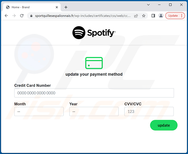 Dans ce cas particulier, les escrocs envoient des courriels déguisés en messages de Spotify demandant aux destinataires de mettre à jour leurs méthodes de paiement via un faux site Web Spotify. Leur objectif principal est de voler des comptes Spotify. Ne faites jamais confiance à ce courriel, ou similaire.
