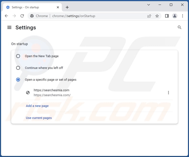 (en haut à droite de Google Chrome), sélectionnez "Paramètres". Dans la section "Au démarrage", désactivez l'extension malveillante (le cas échéant), recherchez une URL de pirate de navigateur (hxxp://www.searchesmia.com) sous l'option "Ouvrir une page spécifique ou un ensemble de pages". Si elle est présente, cliquez sur l'icône des trois points verticaux et sélectionnez "Supprimer".