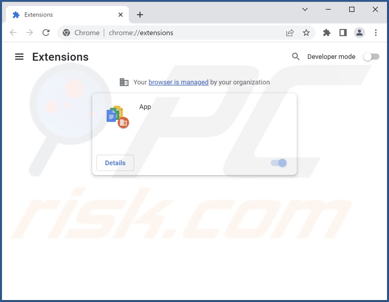 Notre équipe a testé l'extension de navigateur App et a constaté qu'elle fonctionne comme un pirate de navigateur. Le but de cette extension est de promouvoir divers faux moteurs de recherche. De plus, l'extension d'application ajoute la fonctionnalité "Géré par votre organisation" aux navigateurs Chrome. Nous l'avons découvert sur une page Web trompeuse.