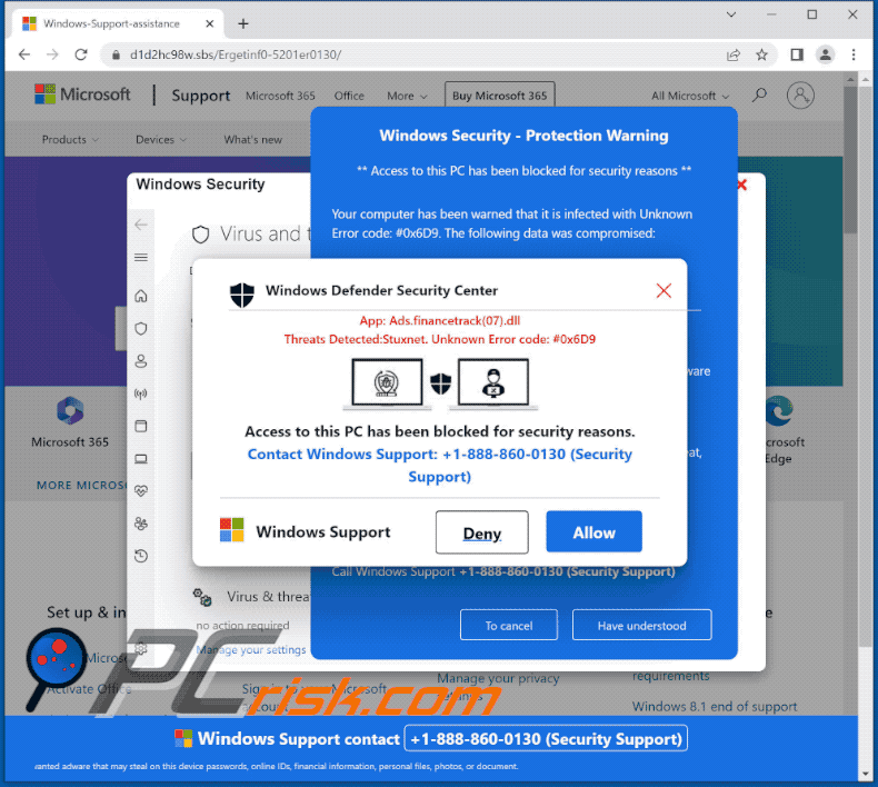 La fenêtre pop-up affichée par la page d'escroquerie au support technique semble provenir du Centre de sécurité Windows Defender, affirmant qu'un programme malveillant appelé "Ads.financetrack(07).dll" a été détecté sur l'ordinateur de l'utilisateur, en même temps que le célèbre virus Stuxnet.