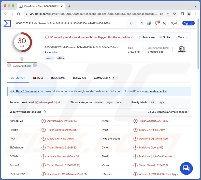 | Noms de Détection | Avast (MacOS:Pirrit-EJ [Adw]), Combo Cleaner (Trojan.Generic.32543582), ESET-NOD32 (Une variante de OSX/Adware.Pirrit.BM), Kaspersky (Not-a-virus:HEUR:AdWare.OSX.Pirrit.ac), Liste complète (VirusTotal) |