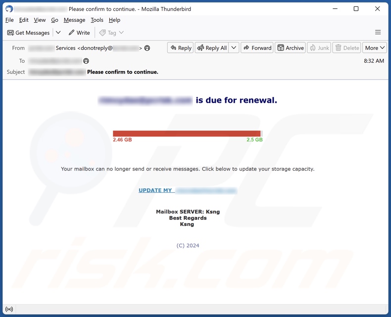 La lettre de spam ayant pour objet "[recipient's_email_address] Please confirm to continue."([adresse_courriel_du_destinataire] Veuillez confirmer pour continuer." (peut varier)) informe le destinataire que son compte courriel doit être renouvelé. Le stockage du compte est sur le point d'atteindre sa limite, à savoir 2,46 Go utilisés sur 2,5 Go. De ce fait, il n'est plus possible d'envoyer ou de recevoir des courriels.