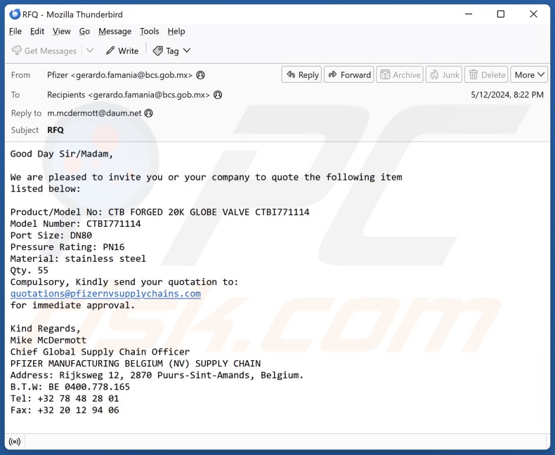 Certains détails de ces courriels et des fichiers joints varient, mais leur objectif est le même : faire croire aux destinataires qu'ils ont reçu une demande de devis de la société Pfizer (un développeur et producteur légitime de médicaments et de vaccins). Dans ces courriels, les destinataires sont encouragés à envoyer le document reçu à l'adresse électronique fournie.