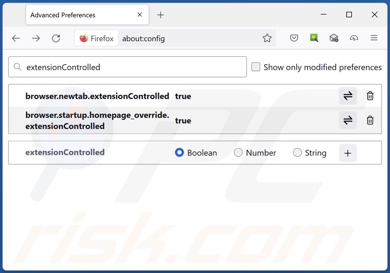 Dans le filtre de recherche en haut, tapez : "extensionControlled". Définissez les deux résultats à "false" en double-cliquant sur chaque entrée ou en cliquant sur le bouton