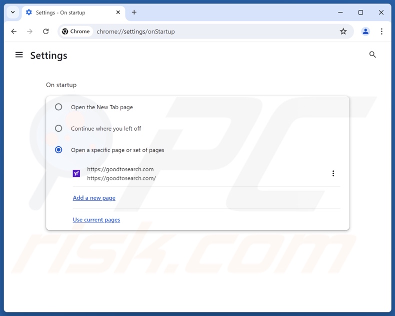 (dans le coin supérieur droit de Google Chrome), sélectionnez "Paramètres". Dans la section "Au démarrage", désactivez l'extension malveillante (si elle est présente), recherchez une URL de pirate de navigateur (hxxp://www.goodtosearch.com) sous l'option "Ouvrir une page spécifique ou un ensemble de pages". S'il est présent, cliquez sur l'icône des trois points verticaux et sélectionnez "Supprimer".