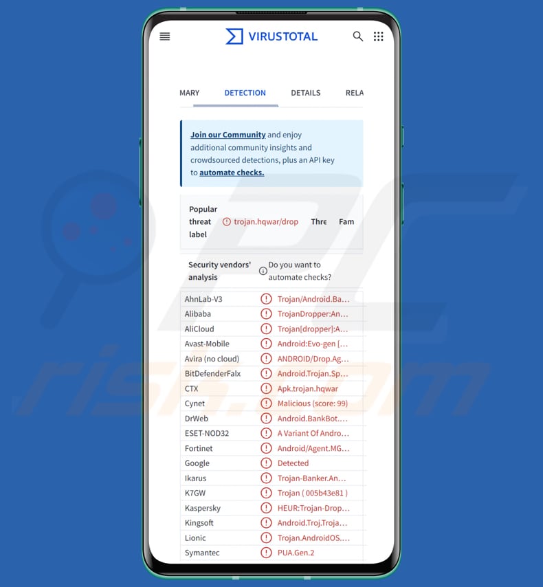 | Noms de détection | Avast-Mobile (Android:Evo-gen [Trj]), Combo Cleaner (Android.Trojan.SpyAgent.PB), ESET-NOD32 (A Variant Of Android/TrojanDropper.Agent.MGV), Kaspersky (HEUR:Trojan-Dropper.AndroidOS.Hqwar.gy), Liste complète (VirusTotal) |