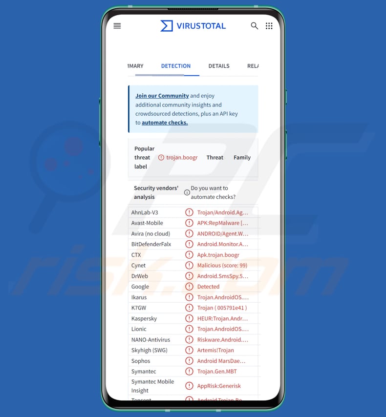 | Noms de détection | Avast-Mobile (APK:RepMalware [Trj]), Combo Cleaner (Android.Monitor.Agent.EM), DrWeb (Android.SmsSpy.559.origin), Kaspersky (HEUR:Trojan.AndroidOS.Boogr.gsh), Liste complète (VirusTotal) |