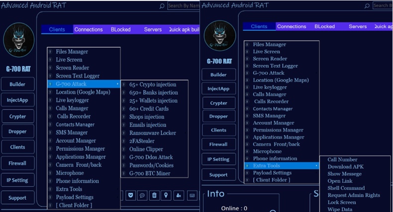 G700 est un cheval de Troie d'accès à distance (RAT) dont certaines versions sont écrites dans les langages de programmation Java et C#. Ce logiciel malveillant ciblant Android est une variante avancée du CraxsRAT. G700 est un programme multifonctionnel doté de capacités étendues de vol de données, d'espionnage et de vol financier.