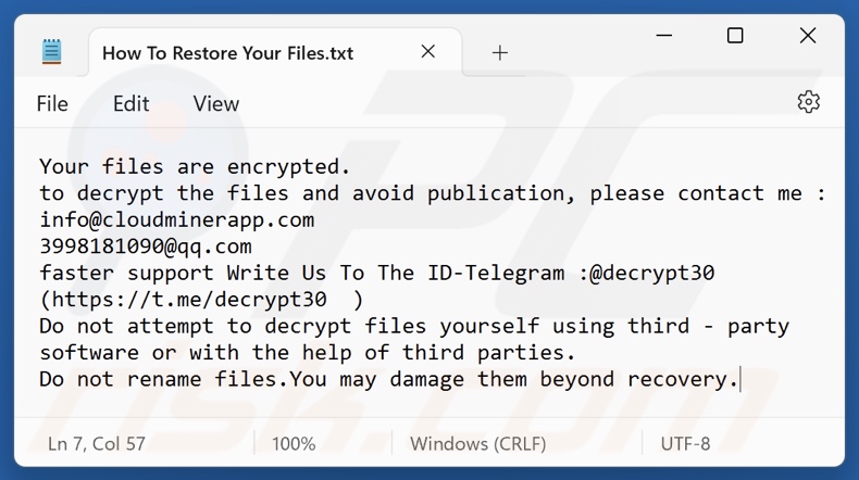 | Contact cybercriminel | info@cloudminerapp.com, 3998181090@qq.com, @decrypt30 (Telegram) |
