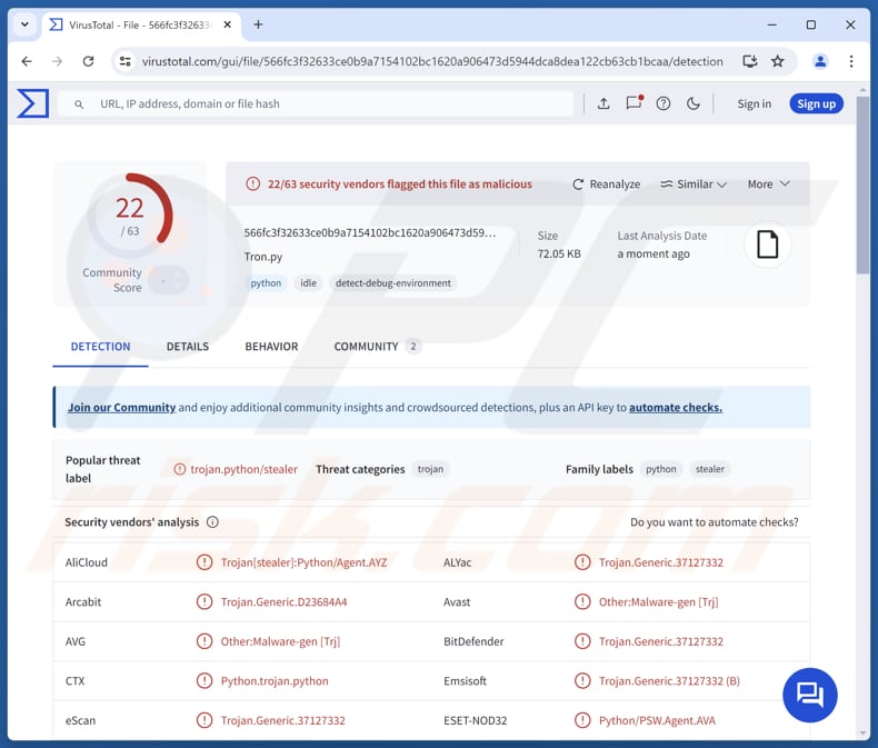 | Noms des détections | Avast (Other:Malware-gen [Trj]), Combo Cleaner (Trojan.Generic.37127332), ESET-NOD32 (Python/PSW.Agent.AVA), Kaspersky (HEUR:Trojan-PSW.Python.Agent.gen), Tencent (Win32.Trojan-QQPass.QQRob.Wwhl), Liste complète (VirusTotal) |