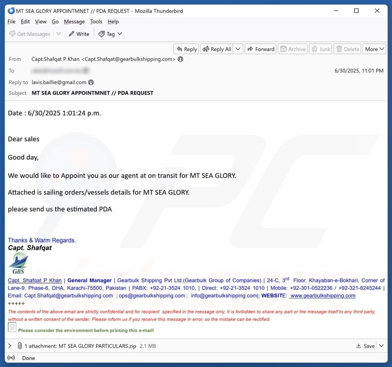 Comme décrit dans l'article ci-dessus, les e-mails comportaient des archives en pièce jointe. Ces archives comprenaient une charge utile cryptée, un fichier exécutable légitime et une DLL malveillante (éventuellement accompagnée d'autres DLL légitimes). Ces e-mails de spam provenaient soit de véritables fournisseurs de services de messagerie électronique, soit de serveurs auto-hébergés.