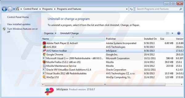 Dans la fenêtre de désinstallation de programmes: Rechercher "Barre d'outils Nation" (Barre d'outils AVG Nation) sélectionnez cette entrée et cliquez ''Désinstallez'' ou ''Supprimez''.