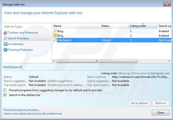 (dans le coin droit en haut dans Internet Explorer) sélectionner ''Gestion des ajouts''. Dans la fenêtre ouverte sélectionnez ''Fournisseurs de recherche'', paramétrer "Google", "Bing" ou tout autre moteur de recherche préféré comme par défaut et supprimer "WebSearch."