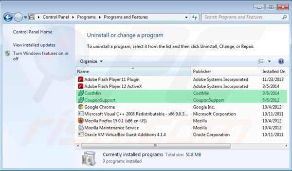 Dans la fenêtre de désinstallation des programmes: rechercher "CostMin" et "CouponSupport", sélectionnez ces entrées et cliquez ''Désinstaller'' ou ''Supprimer''.