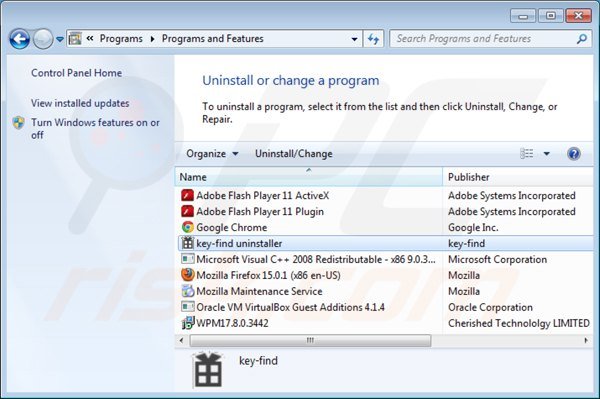 Dans la fenêtre de désinstallation des programmes: rechercher "WPM17.8.0.3442" et "key-find uninstaller", sélectionner ces entrées et cliquer ''Désinstaller'' ou ''Supprimer''.