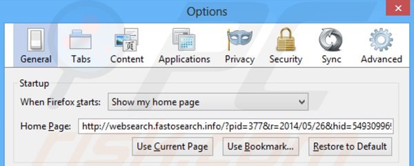 - ÉTAPE 4. Suppression de la page d'accueil et du moteur de recherche par défaut de websearch.fastosearch.info dans Mozilla Firefox.