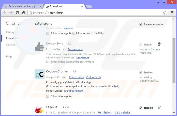 (dans le coin supérieur droit dans Google Chrome), sélectionnez "Outils" et cliquez sur "Extensions". Trouver "Severe Weather Alerts", sélectionnez cette entrée et cliquez sur l'icône de la poubelle. Notez que les publicités Severe Weather Alerts peuvent être causées par d'autres logiciels de publicité. Dans la fenêtre ''extensions'', supprimez tous les extensions de navigateur suspicieuses.