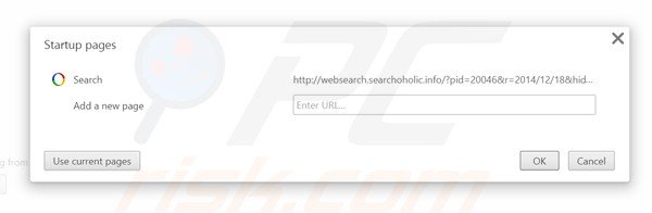 (dans le coin supérieur droit de Google Chrome), sélectionnez ''Paramètres''. Dans la section ''Démarrage'' cliquez sur ''paramétrez les pages'', survolez hxxp://websearch.searchoholic.info et cliquez sur le symbole x. Maintenant vous pouvez ajouter votre site web préféré comme votre page d'accueil.
