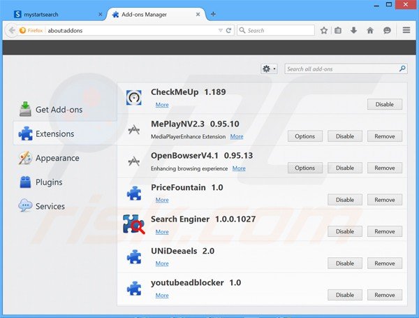 (dans le coin supérieur droit de la fenêtre principale), sélectionnez "Ajouts". Cliquez sur "Extensions", dans la fenêtre ouverte, supprimez tout plug-in de navigateur suspicieux récemment installés ("Fast Start").