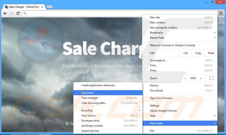 (dans le coin supérieur droit dans Google Chrome), sélectionnez "Outils" et cliquez sur "Extensions". Trouver : "Sale Charger", sélectionnez cette entrée et cliquez sur l'icône de la poubelle.