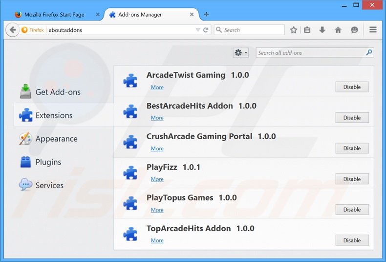 (dans le coin supérieur droit de la fenêtre principale), sélectionnez "Ajouts." Cliquez sur "Extensions" dans la fenêtre ouverte, supprimez "ArcadeTwist Gaming".