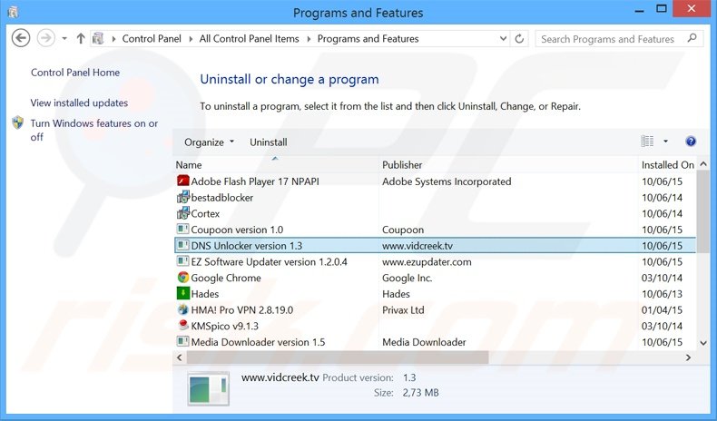 Dans la fenêtre de désinstallation des programmes: rechercher "DNS Unlocker version 1.3", sélectionnez cette entrée et cliquez ''Désinstaller'' ou ''Supprimer''.
