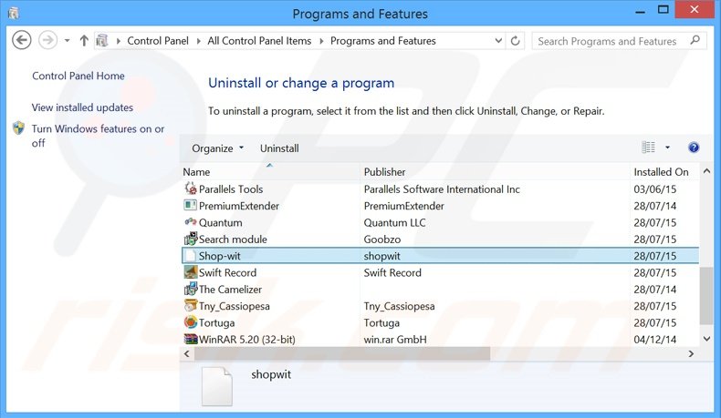 Dans la fenêtre de désinstallation des programmes: rechercher "Shop-wit", sélectionnez cette entrée et cliquez ''Désinstaller'' ou ''Supprimer''.