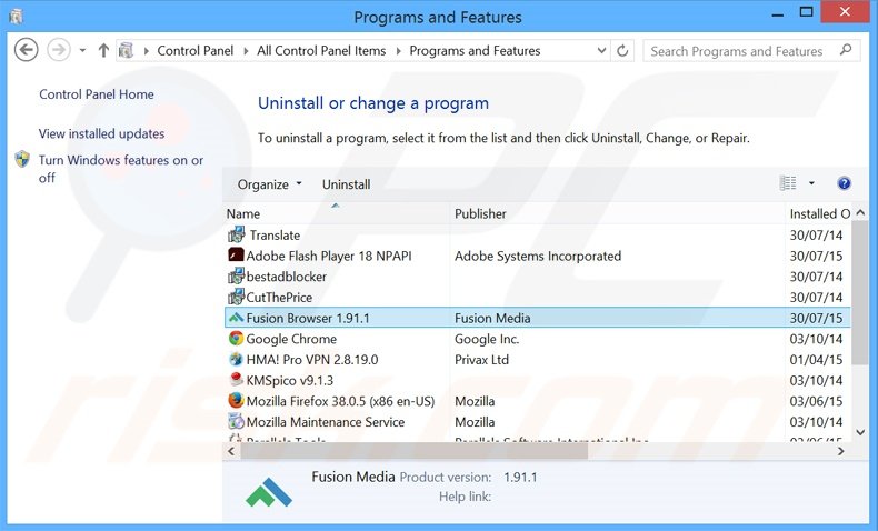 Dans la fenêtre de désinstallation des programmes: rechercher "Fusion Browser", sélectionnez cette entrée et cliquez ''Désinstaller'' ou ''Supprimer''.