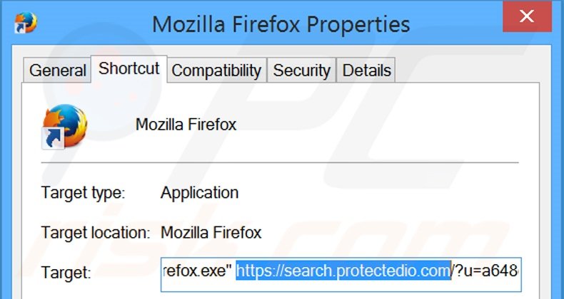 Ce pirate de navigateur change le champ ''Cible'' dans le raccourci dans Mozilla FireFox. Pour réparer ceci - trouvez votre raccourci Mozilla FireFox sur votre bureau et cliquer droite avec la souris dessus. Changer votre page d'accueil: Dans le menu ouvert choisissez ''Propriétés''. Dans la fenêtre ouverte trouver le champ Cible et éliminer tout le texte (hxxp://search.protectedio.com/...), qui se trouve après "C:\Program Files\Mozilla Firefox\firefox.exe"