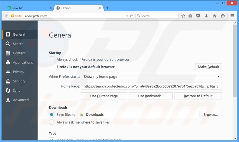 (dans le coin supérieur droit de la fenêtre principale) ensuite sélectionnez "Options," dans la fenêtre ouverte supprimer hxxp://search.protectedio.com et entrer votre domaine préféré qui s'ouvrira chaque fois que vous démarrez Mozilla Firefox.