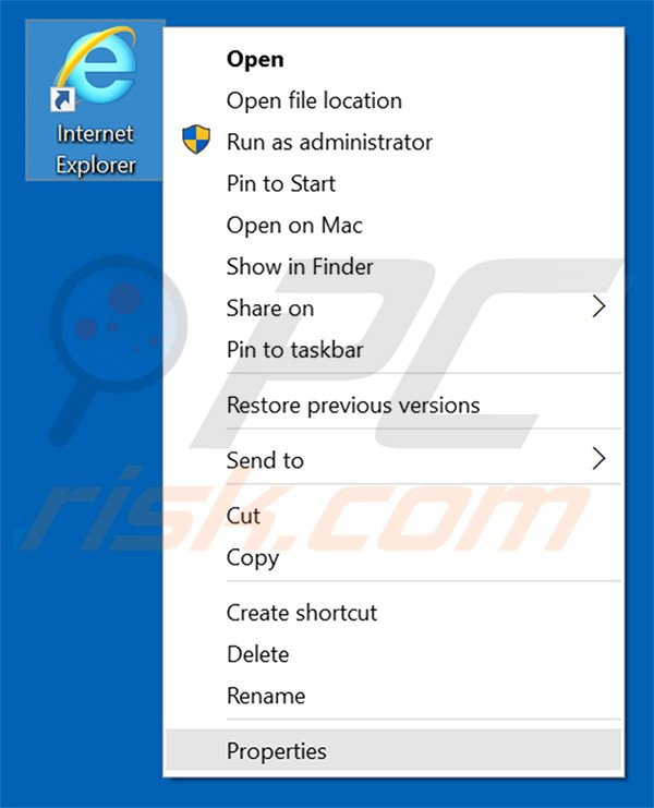 Ce pirate de navigateur qui change le raccourci du champ ''Cible'' d'Internet Explorer. Pour réparer ceci - localiser le raccourci sur votre Bureau et cliquez dessus avec le bouton droit de la souris. Dans le menu ouvert choisissez "Propriétés". Dans la fenêtre ouverte localiser le champ cible et éliminer le texte (hxxp://www.bing.vc/...), qui est entré après "C:\Program Files\Internet Explorer\iexplore.exe".
