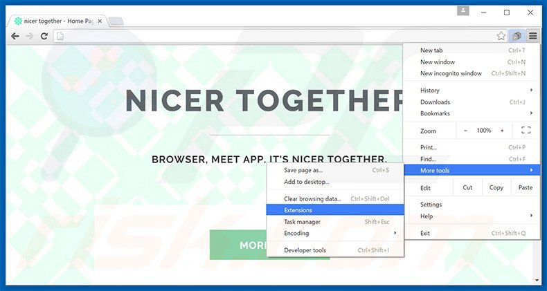 Si vous continuez à avoir des problèmes avec le nicer together adware, restaurez les paramètres de votre navigateur Google Chrome. Cliquer 'icône du menu Chromel