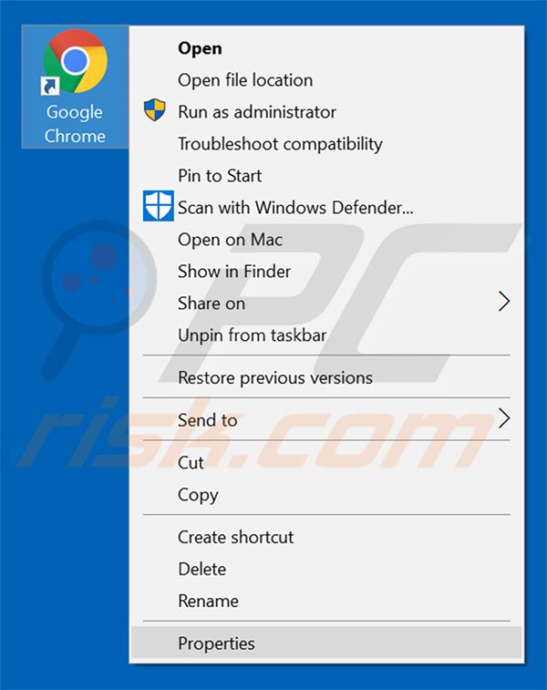 Ce pirate de navigateur qui change le raccourci du champ ''Cible'' dans Google Chrome. Pour réparer ceci - localiser le raccourci Google Chrome sur votre Bureau et cliquez dessus avec le bouton droit de la souris. Dans le menu ouvert choisissez "Propriétés". Dans la fenêtre ouverte localiser le champ cible et éliminer tout le texte en entier avec l'emplacement du navigateur "C:\Program Files\Google\Chrome\Application\chrome.exe"