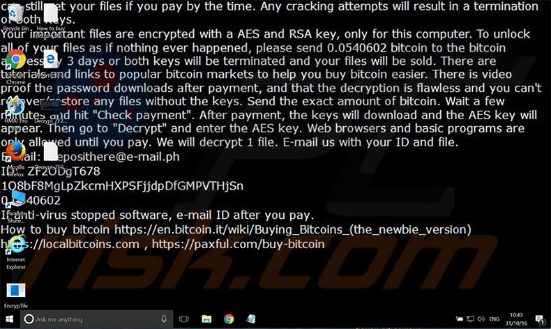 Les trois fichiers "Decrypt_[victim's_id]" contiennent le même message demandant une rançon. Ce message est aussi fourni dans une fenêtre pop-up. Il énonce que les fichiers sont encryptés et qu’ils peuvent seulement être restaurés en utilisant des clefs de décryptage uniques. Afin de recevoir les clefs er restaurer leurs fichiers, les victimes doivent payer une rançon de 0.540602 Bitcoins (valant actuellement, ~$38). La rançon doit être payée dans le délai donné (la fenêtre pop-up contient le compteur), autrement les clefs seront supprimées de façon permanente et il deviendra impossible de décrypter les fichiers. La fenêtre pop-up contient aussi une liste des fichiers encryptés, l’adresse Bitcoins, une vidéo affichant les fichiers qui peuvent être décryptés, et le bouton de décryptage. On permet aux victimes d’envoyer un fichier via l’adresse email fournie (deposithere@e-mail.ph). Il sera ensuite décrypté et renvoyé à la victime – cela est supposé être une garantie que les fichiers peuvent réellement être décryptés. Cependant, nous vous recommandons fortement d’ignorer tous les encouragements à payer/contacter les développeurs du rançongiciel. Ces personnes ignoreront probablement les victimes, même si le paiement est soumis. Donc, les chances sont que payer ne donnent aucune résultat positif et que vous soyez arnaqué sont élevés. Malheureusement, les déclarations disant que les fichiers peuvent seulement être restaurés avec les clefs privées sont vraies – il n’y a actuellement aucun outil capable de craquer les algorithmes AES et RSA susmentionnés. Donc, la seule solution possible est de restaurer les fichiers et/ou le système à partir d’une sauvegarde.