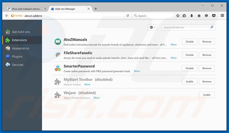 (dans le coin supérieur droit de la fenêtre principale), sélectionnez "Ajouts." Cliquez sur "Extensions" dans la fenêtre ouverte supprimez tous les plug-ins de navigateur suspects récemment installés.