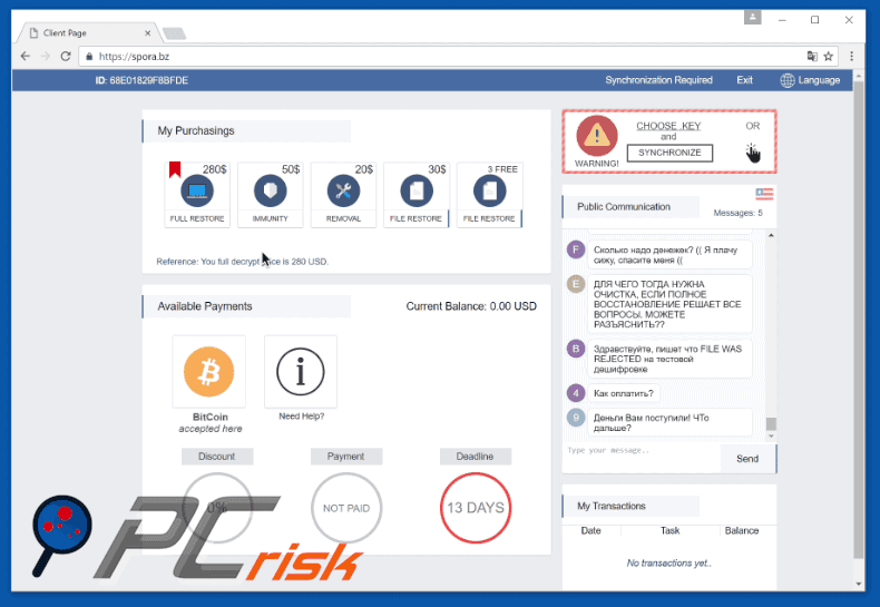 Un des principaux avantages de Spora pour les développeurs est la possibilité de travailler hors ligne (sans une connexion internet). Tel que mentionné ci-dessus, les fichiers sont encryptés en utilisant la cryptographie RSA (un algorithme de cryptage asymétrique) et, donc, des clefs publiques (cryptage) et privées (décryptage) sont générées durant le processus de cryptage. Le décryptage sans la clef privée est impossible. En plus, la clef privée est aussi encryptée en utilisant la cryptographie RSA, ce qui fait qu’empirer la situation. En plus d’encrypter les fichiers, Spora désactive la réparation au démarrage de Windows, supprime les clichés instantanés des volumes, et change la politique du statut de redémarrage. Le fichier HTML contient un message en russe demandant une rançon, qui détaille le cryptage et encourage les victimes à suivre les instructions fournies par le site web de Spora. Pour restaurer les fichiers, les victimes doivent supposément payer une rançon. Le montant de la rançon dépend de chaque situation individuelle et des exigences de la victime. Le décryptage complet (incluant l’immunité, la suppression et la restauration des fichiers) est approximativement équivalent à 79$-280$, cependant, les victimes peuvent choisir de seulement restaurer les fichiers, les supprimer, ou recevoir l’immunité. Dans ces cas, le prix est réduit. Les victimes ont aussi la permission de décrypter deux fichiers gratuitement. La rançon doit être payée en Bitcoins et les victimes ont un temps limité (le délai est donné sur le site web de Spora) pour faire le paiement, autrement les clefs de décryptage seront supprimé de façon permanente. Le site web de Spora est avancé comparativement aux autres virus du même type. Il fournit à chaque victime un compte contenant un portefeuille Bitcoin. Il y a aussi des fonctions pour le décryptage, les transactions, contacter les développeurs, etc. Au moment d’écrire, il n’y a aucun outil capable de restaurer les fichiers encryptés par le rançongiciel Spora. Donc, la seule solution est de restaurer vos fichiers/votre système à partir d’une sauvegarde.