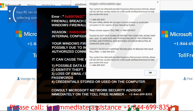 Le pop-up énonce que une activité de rançongiciel a été détectée et que le pare-feu de Windows a été désactivé. De plus, il énonce que les détails personnels tels que les fichiers, les identifiants de connexion/les mots de passe, les détails bancaires, etc., sont à risque et que le logiciel malveillant doit être élimé immédiatement. Les victimes sont encouragées à contacter les techniciens de Microsoft via le numéro de téléphone sans frais ("+1-844-699-8351") fourni. Ces ‘’techniciens’’ guide supposément les victimes durant le processus de suppression. Tel que mentionné ci-dessus, cependant, l’erreur "Activité de Rançongiciel Suspect" est fausse. Ce pop-up tente de faire peur aux victimes et de les tromper afin qu’elles contactent un faux soutien à la clientèle et paient pour des services qui ne sont pas nécessaires. Le logiciel de publicité n’existe pas et, donc, ce message d’erreur devrait être ignoré. Vous pouvez le supprimer en fermant le navigateur web. De plus, les PPI délivrent des bannières, des coupons, des pop-up, et d’autres publicités similaires en employant une ‘’couche virtuelle’’ - un outil qui permet le placement de contenu graphique de tierces parties sur n’importe quel site. Les publicités affichées cachent le contenu sous-jacent et mènent souvent à des sites web malicieux – même un clic accidentel pourrait mener à des infections de logiciels de publicité ou de logiciels malveillants à hauts risques. De plus, les PPI rassemblent continuellement diverses informations reliées à l’activité de navigation des utilisateurs. Les informations collectées (l’adresse IP, les URL visités, les demandes de recherche, etc.) pourraient contenir des détails personnels que les développeurs partagent avec de tierces parties (potentiellement, des cybers criminels) qui utilisent mal les détails privés pour générer des revenus. Donc, le suivi d’informations peut mener à de sérieux problèmes de vie privée ou même au vol d’identité. Pour toutes les raisons ci-dessus, les PPI devraient être installés immédiatement.