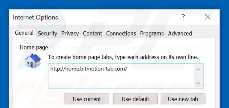 (dans le coin supérieur droit d'Internet Explorer), sélectionnez ''Options Internet'', dans la fenêtre ouverte supprimer hxxp://home.bitmotion-tab.com et entrer votre domaine préféré, lequel ouvrira chaque fois que vous lancez Internet Explorer. Vous pouvez aussi entrer about: blank pour ouvrir une page blanche quand vous démarrez Internet Explorer.